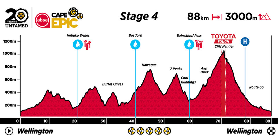 The Queen Stage of the 2024 Absa Cape Epic, Stage 4 will demand every individual and team rises to the gauntlet laid down by the untamed. Featuring more metres of climbing than any stage in recent years Stage 4 is defined by ascents. Pataskloof and the Hawequas Scout Camp climbs are the first order of the day, before Beula and Buffet Olives lead to the Hawequas Bergpad. Once the dual tracks turn to singletracks the climbing becomes even steeper, up 7 Peaks and the never-ending switchbacks of Aap d’Huez, DNF and the Cliff Hanger. There are incredible descents too, with Cool Runnings, Cool Runnings Too, Brandslang Neck, Full Monty and Route 66 all adding excitement to a day rising into the clouds.